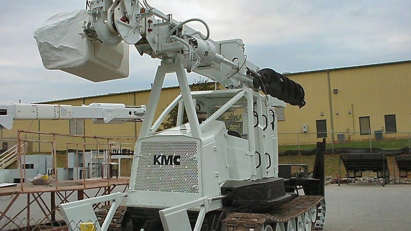 The KMC tracked Vehicle is the perfect carrier for a variety of specialized off-road utility equipment such a Digger-Derricks, Man lifts, Spool carriers, and flat deck equipment transporters. Equipped with a 6-way hydraulic doze blade, it can plow snow or create its own access for emergency storm recovery work on severe terrain.